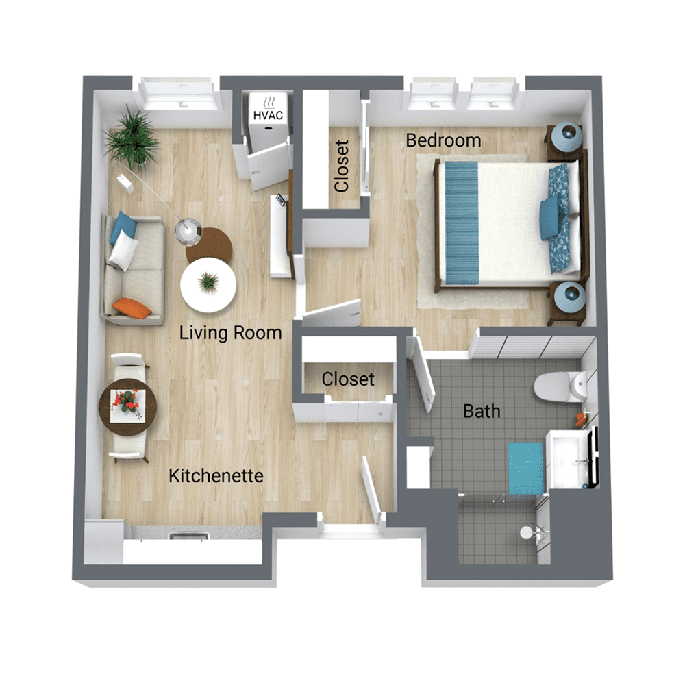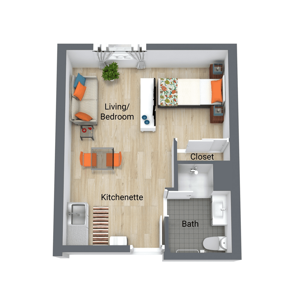 We offer spacious studio and one‑bedroom apartments. Every apartment is private, features a walk‑in shower with built‑in safety features, and can be fully personalized with your own furniture and décor—so it truly feels like home from day one.